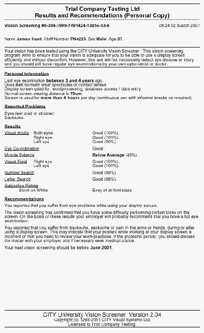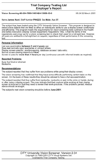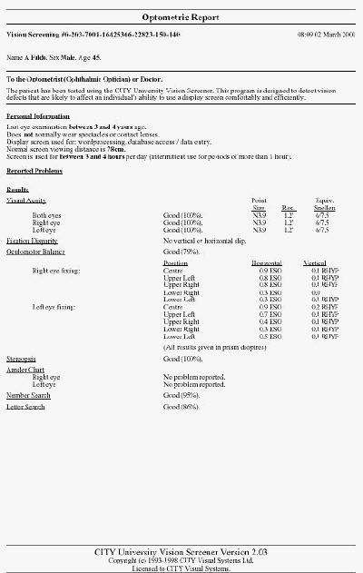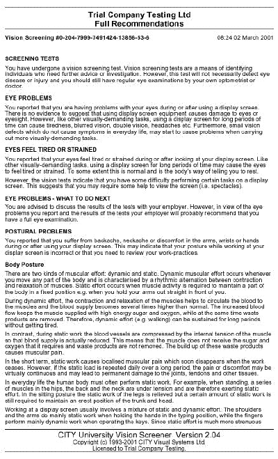 Optometric Report, this can provide useful information for the Optometrist. A second page can be printed and used as a return form, clearly stating if any correction is only for DSE work.